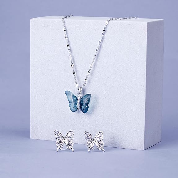 - 🦋 Elegant Butterfly Design – Features a charming blue butterfly pendant necklace paired with delicate butterfly stud earrings, symbolizing beauty, transformation, and freedom.